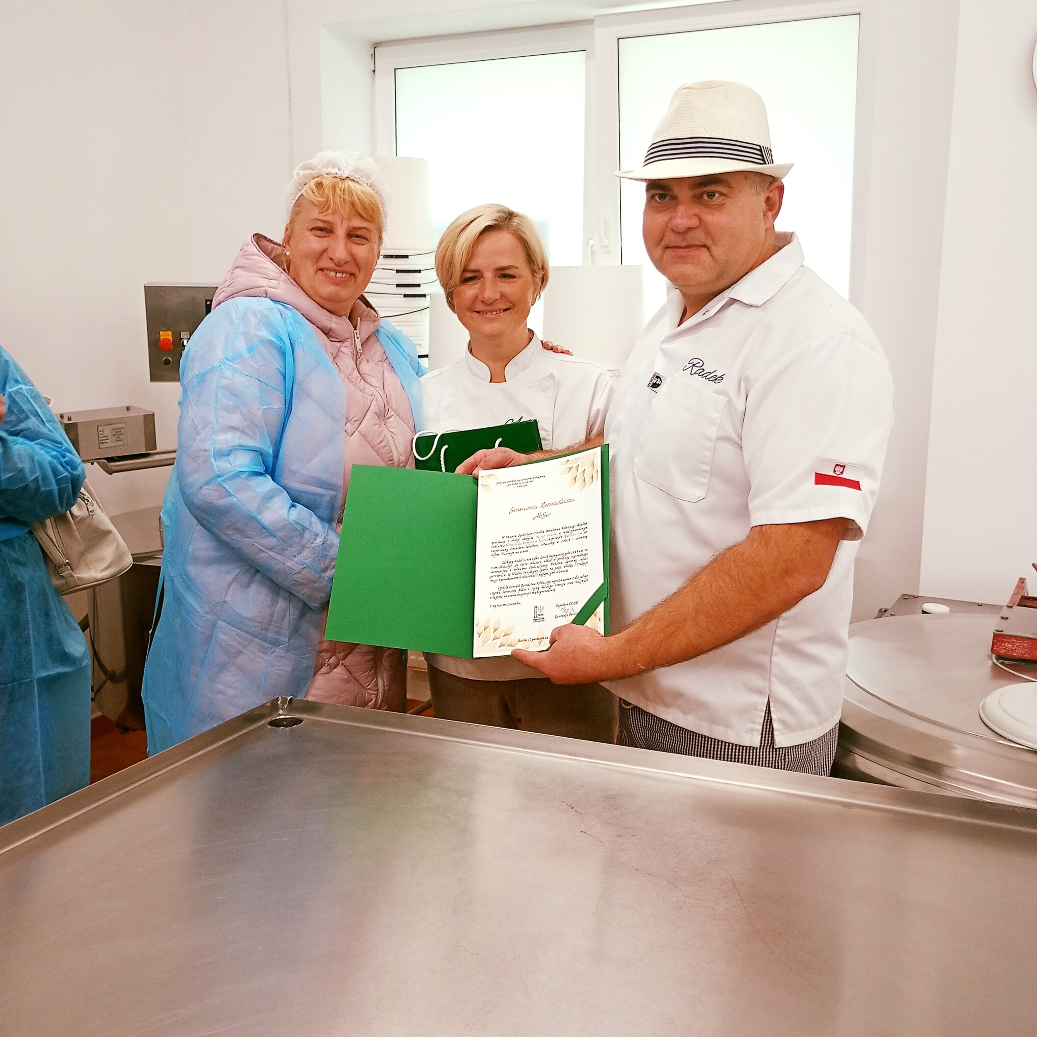 Kolejnym przystankiem była serowarnia AH Ser Namysłów, gdzie gospodarze – Pani Anna i Pan Radek Smreczak – przyjęli grupę niezwykle serdecznie, częstując świeżymi, aromatycznymi serami. Przy okazji wizyty Pani Renata Wojas wręczyła właścicielom list gratulacyjny od OODR w Łosiowie za zdobycie złotego medalu w prestiżowym konkursie Mondial du Fromage we Francji – jeszcze raz serdecznie gratulujemy tego wyjątkowego sukcesu!