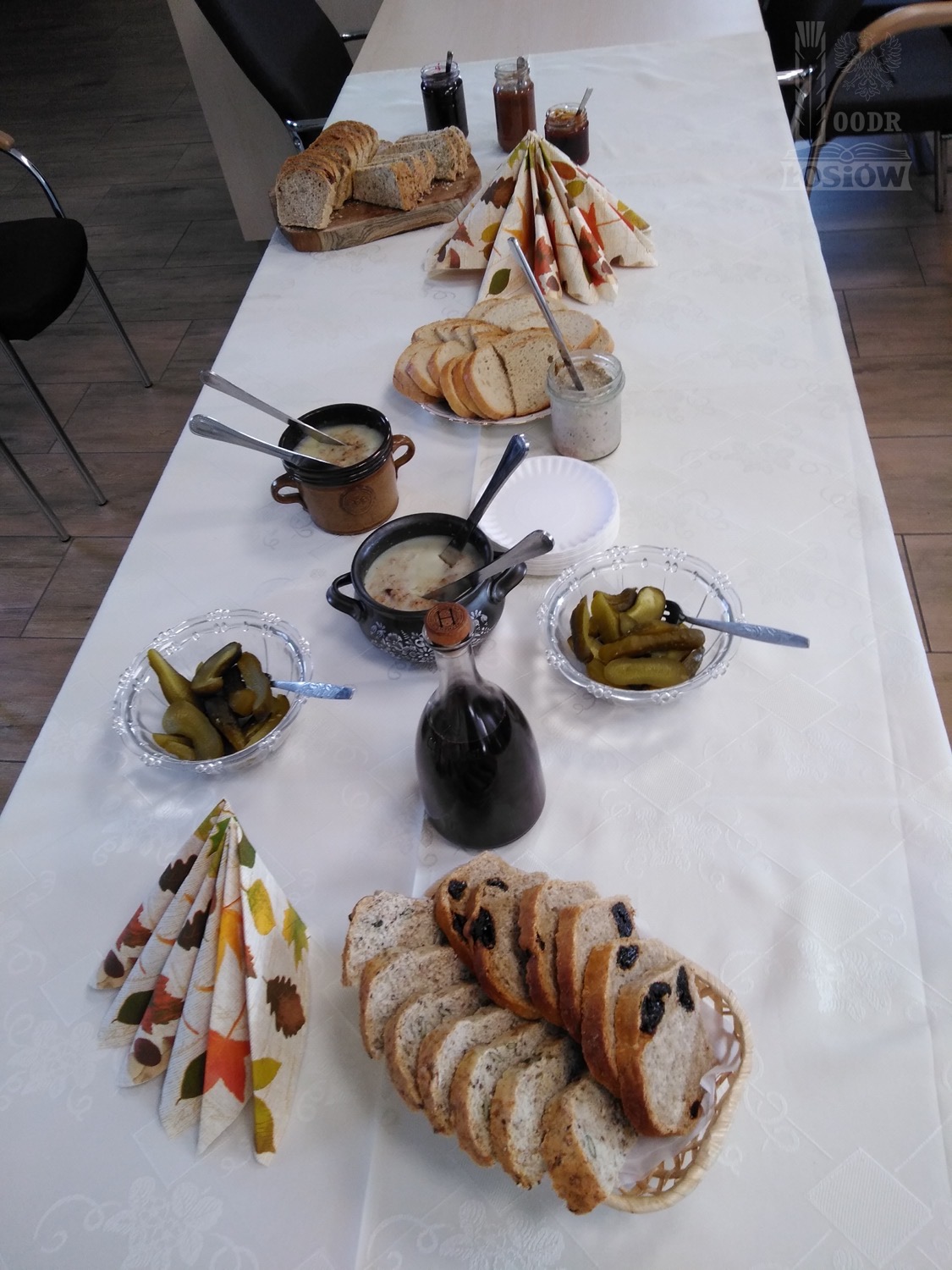 Podczas jednego ze spotkań okazjonalnych u Pani Teresy Kamienieckiej-Hreczaniuk narodził się pomysł zorganizowania szkolenia o historii chleba. I tak o kromce chleba, którą dawniej i po dzień dzisiejszy smarujemy smalcem z dodatkami szeroko opowiadała Pani Teresa. Podczas spotkania uczestnicy mogli również podzielić się swoimi tradycjami z rodzinnych domów oraz wymieniali się przepisami na wypiek chleba tradycyjnego z dodatkami. Na zakończenie odbyła się degustacja chleba wypieczonego przez same uczestniczki z zastosowaniem różnych składników i starodawnych przepisów. Od tradycyjnego chleba po dodatki typu śliwka można było skosztować i posmarować kromkę chleba smalcem specjalnie przygotowanym przez Panią Teresę Kmieniecką-Hreczaniuk czy powideł jej receptury. Do popicia można było skosztować zakwasu z buraków również Pani Teresy. Wspaniały pasztet Pani Gabrieli Neugebauer czy chleb od Pani Grażyny Wolder znikały ze stołu w mgnieniu oka.