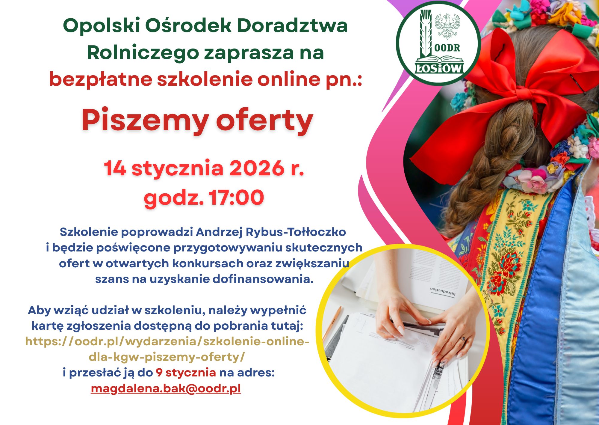 Zapraszamy Koła Gospodyń Wiejskich do udziału w bezpłatnym szkoleniu online pn. „Piszemy oferty”.