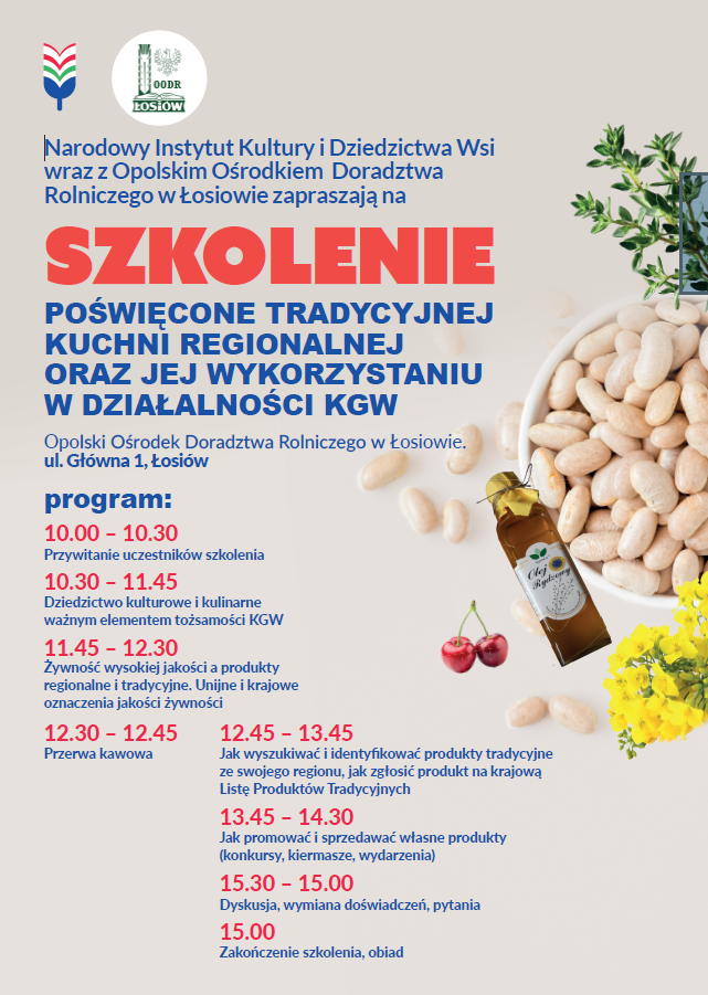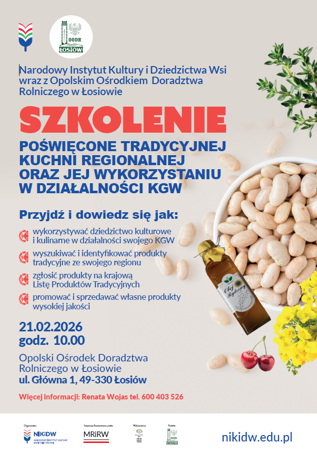 Serdecznie zapraszamy członków Kół Gospodyń Wiejskich na szkolenie stacjonarne pn. „Dziedzictwo kulinarne regionu w praktyce KGW”, organizowane przez Narodowy Instytut Kultury i Dziedzictwa Wsi we współpracy z Opolskim Ośrodkiem Doradztwa Rolniczego w Łosiowie.
