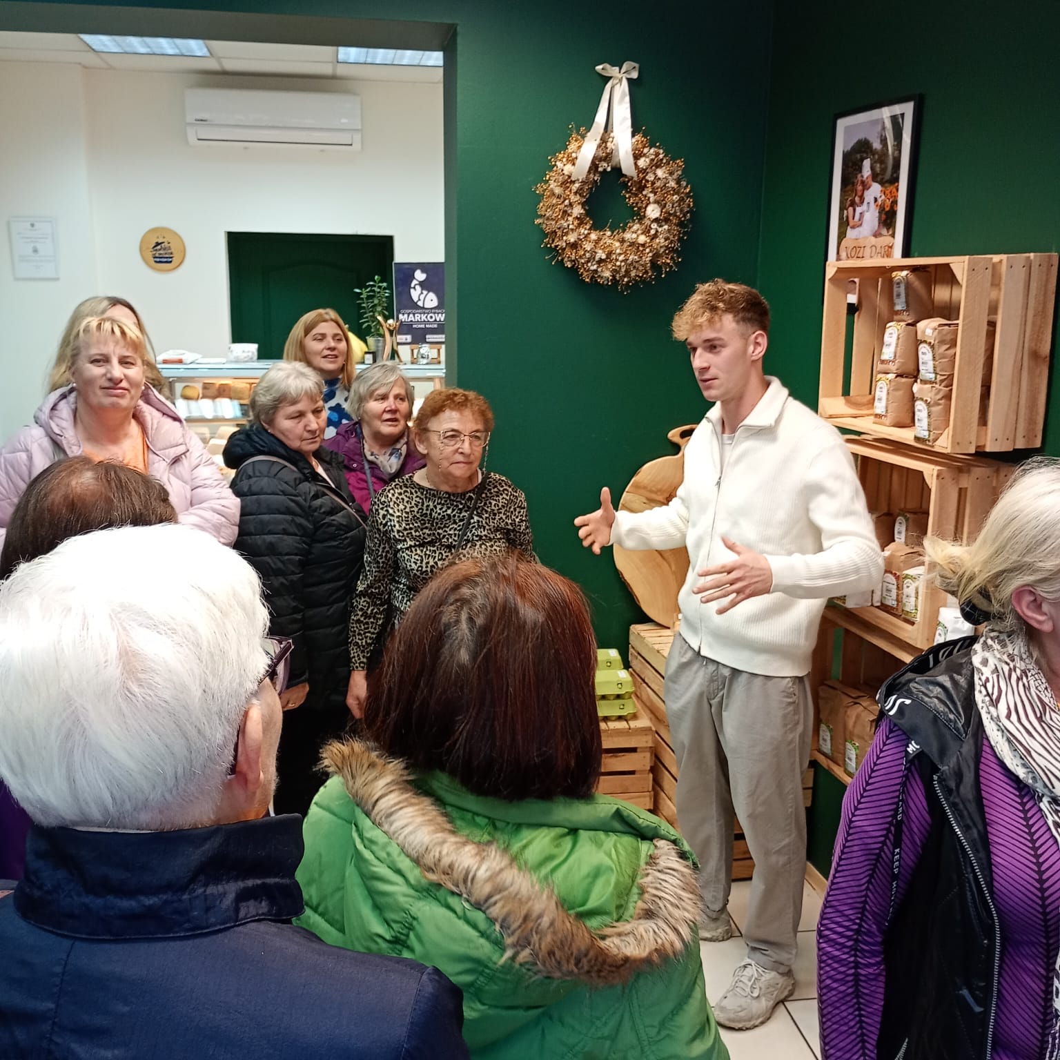 Następnie grupa odwiedziła Pasiekę Zarodową w Maciejowie, gdzie podczas oprowadzania po budynkach uczestnicy poznali fascynujący świat pszczół i innych owadów, a także historię tego wyjątkowego miejsca. Po części edukacyjnej przyszedł czas na degustację miodów i zakupy w sklepie przy pasiece.