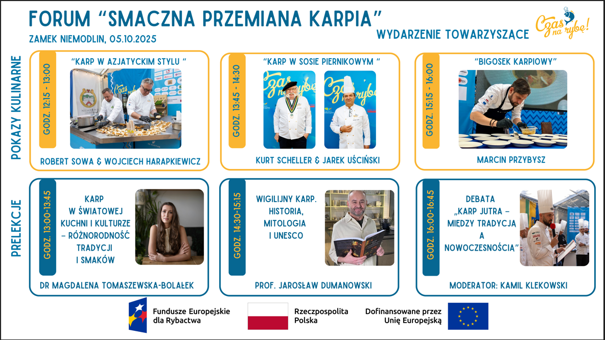 W piątek (3.10.2025) miłośników gotowania zapraszamy do kibicowania uczniom szkół gastronomicznych, którzy będą walczyli w Konkursie “Czas na rybę! Junior”. Wstęp na wydarzenie jest otwarty, można przyjść i zainspirować się karpiowymi potrawami, w godzinach 10-15.
